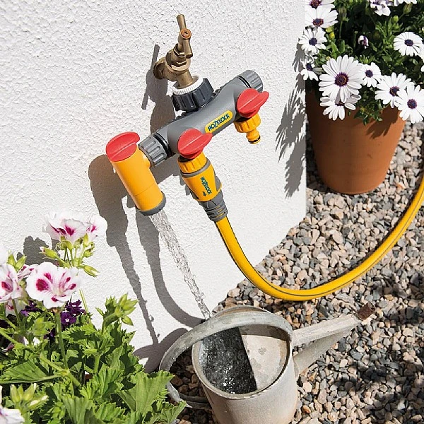 - The Hozelock Flowmax 3-Way Tap Connector allows you to connect two watering devices or hose pipes. A third outlet for filling a bucket or watering can is also permanently accessible and easy to use